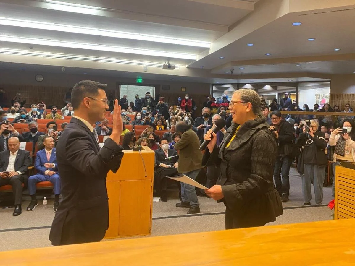 Image: Thomas Wong was sworn in as Monterey Park City Council Member by Betty Yee, Vice Chair of the California Democratic Party and formed state controller, last December, before the incident.